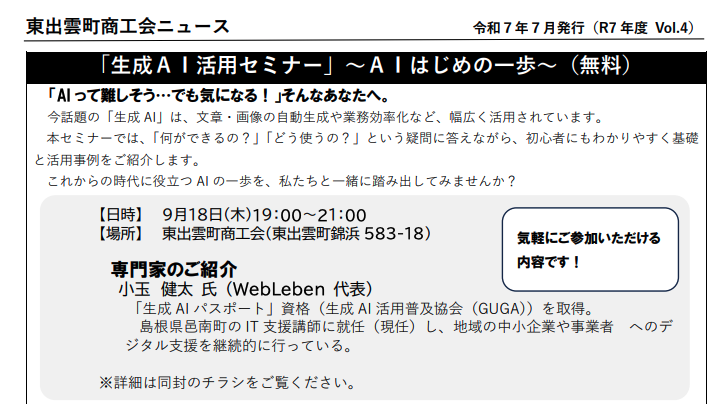 2025年9月、島根県東出雲町商工会主催「生成AI活用セミナー ~AIはじめの一歩~」に登壇いたしました。