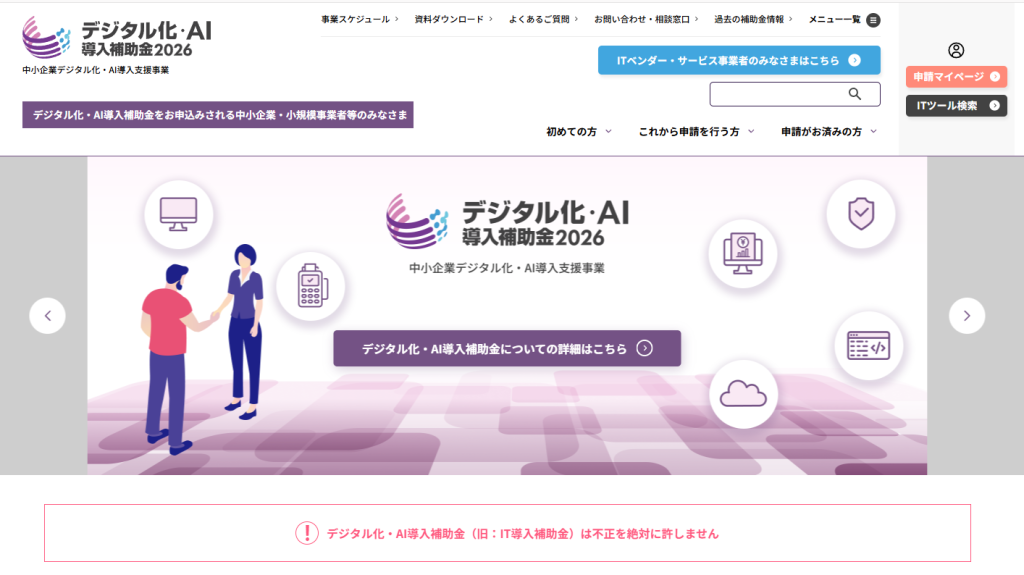 IT導入補助金は2026年度から名称にも「AI」が加わり、AI機能を持つツール導入への加点が強化されています(中小企業庁、2026年度IT導入補助金公募要領)。