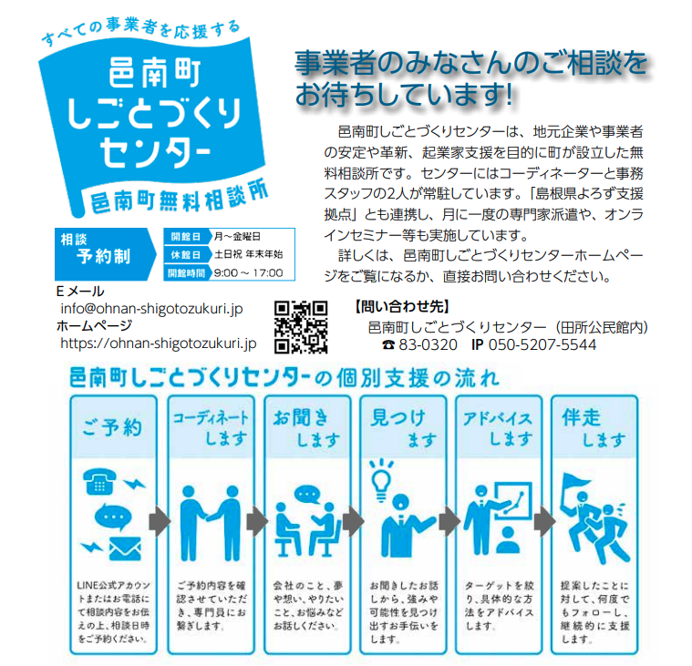 邑南町しごとづくりセンターは、地元企業や事業者の安定や革新、起業支援などを目的に設立された無料相談所です。