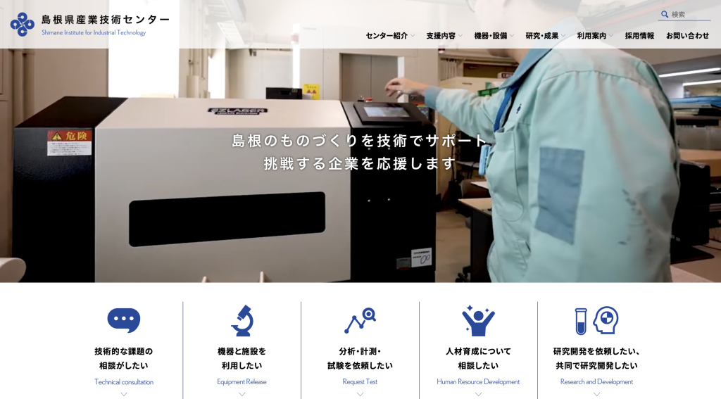島根県産業技術センターは、松江市北陵町に本所を構え、浜田市に支所(浜田技術センター)を持つ県の技術支援機関です。