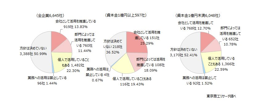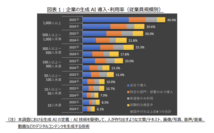一方、東京商工リサーチの調査(2025年7〜8月、有効回答6,645社)では、生成AIの業務活用を推進している企業は全体の約25%と報告されています。