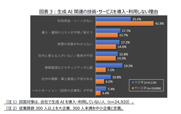 また、情報通信総合研究所の調査では、中小企業で最も多い未導入理由は「利用用途・シーンがない」(41.9%)でした。